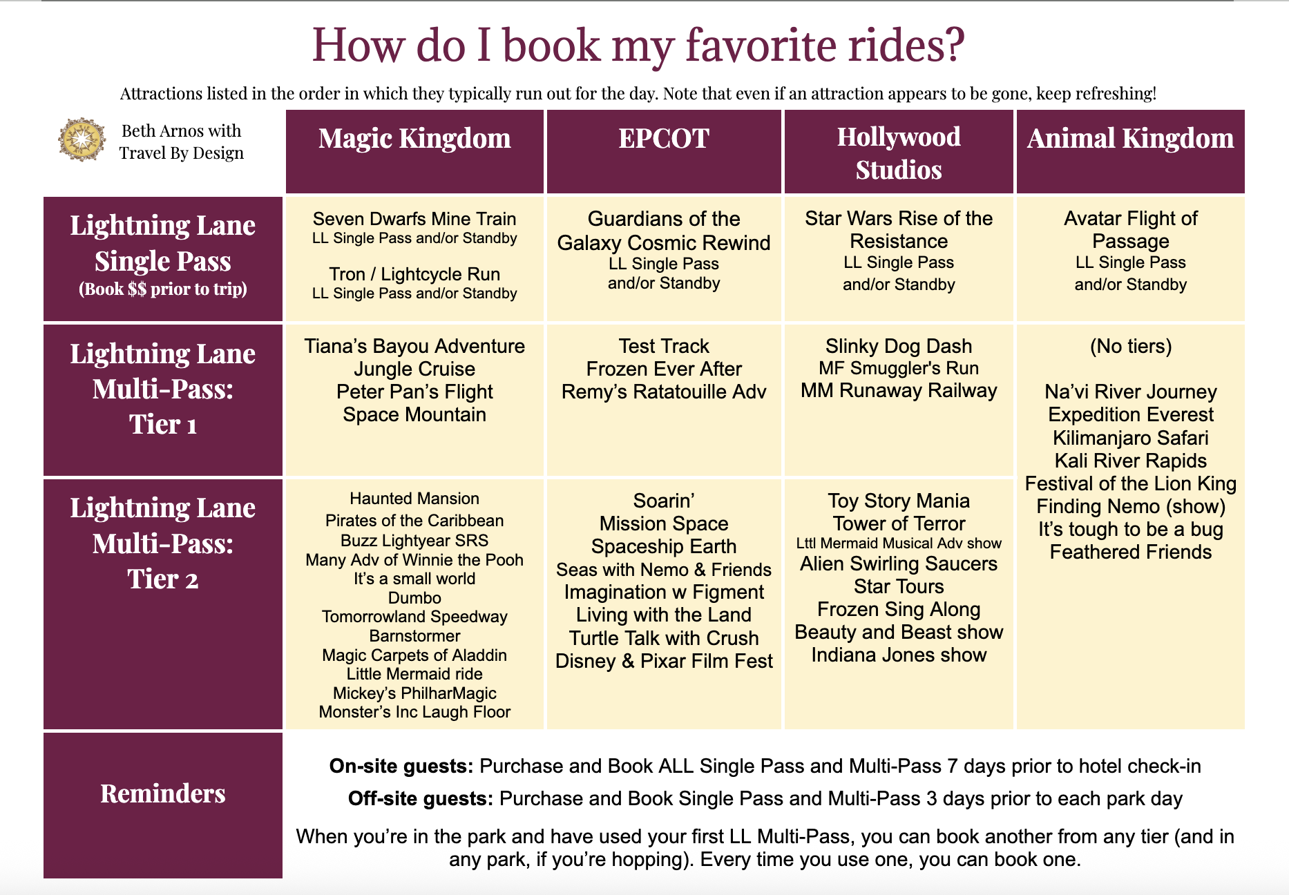 Or, do you want to skip the hassles of reserving ride times all together? Go with Premier Pass instead. One flat rate, one park per day, ride every ride once via Lightning Lane, whenever you choose. But it comes at a premium. Read more here.